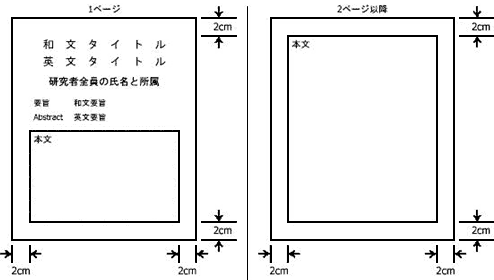 - 原稿の書式は、以下の図1または図2のいずれかの書式を用いて下さい。